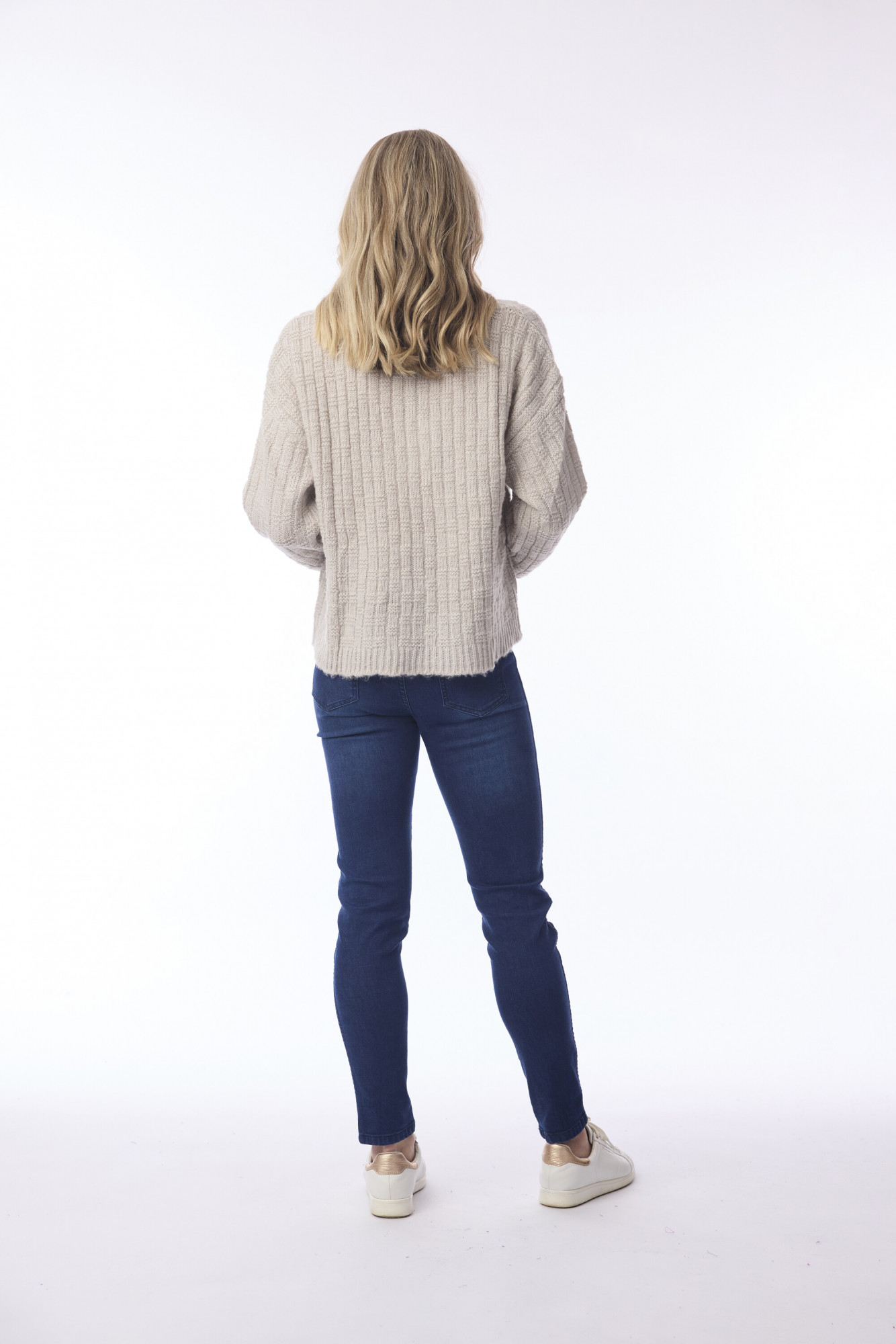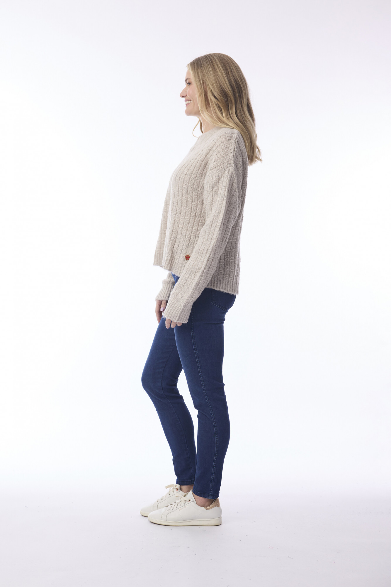 This cropped V-neck jumper is crafted from 100% wool, offering natural warmth and soft comfort. Designed in a loose, boxy silhouette, it features a shallow V-neckline, long relaxed sleeves, and a subtly ribbed texture for visual interest. Falling above the hip, the jumper is perfect for layering or wearing alone, with a small side embellishment detail at the hem for a refined touch.