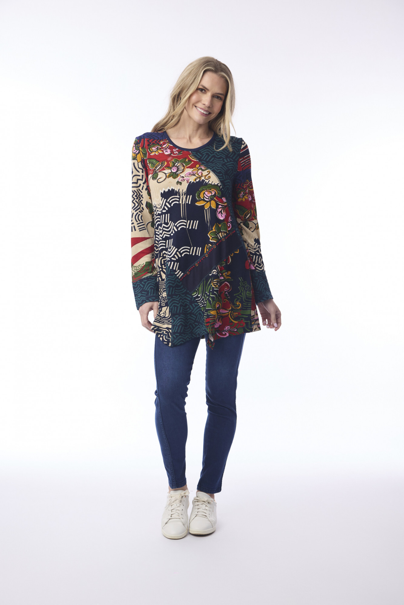 Crafted from 100% cotton, the Zapotec Tunic Patch combines comfort with effortless style. Featuring a round neckline and asymmetric hem, it creates a flattering silhouette that’s easy to wear all day. Adorned with abstract winter floral prints, this tunic adds timeless charm and a touch of vibrancy to your winter wardrobe.